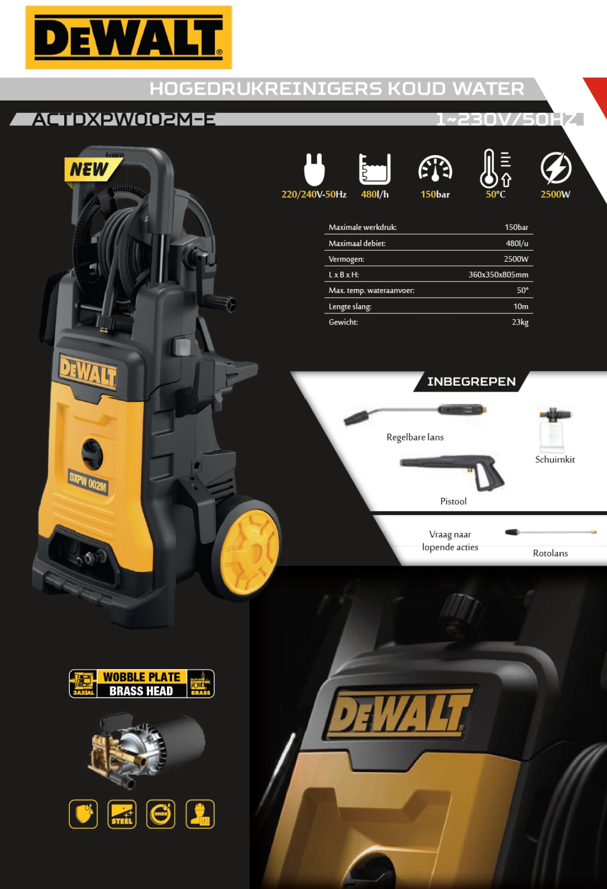 Dewalt actdxpw002m-e hogedrukreiniger 150 bar 480 l/u 2500w ACTDXPW002M-E-TOU