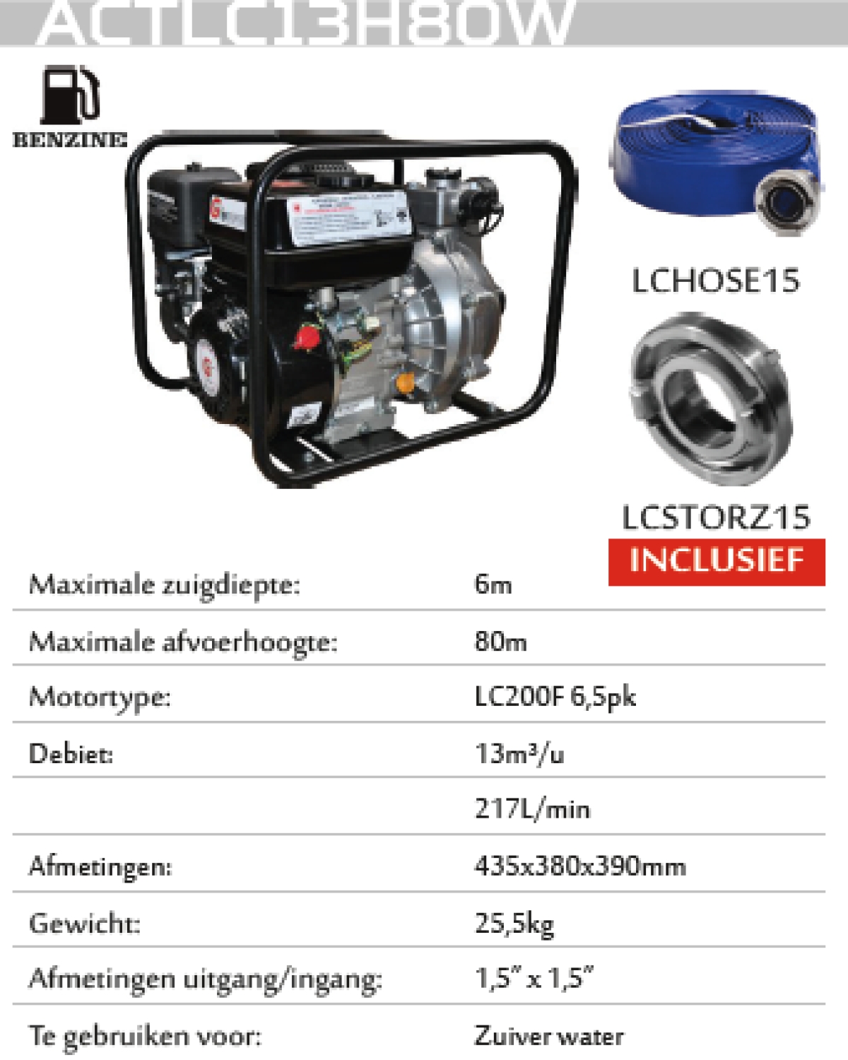 Genermore actlc13h80w motorpomp 6.5 pk 13 m³/u 217 l/min zuiver water - benzine