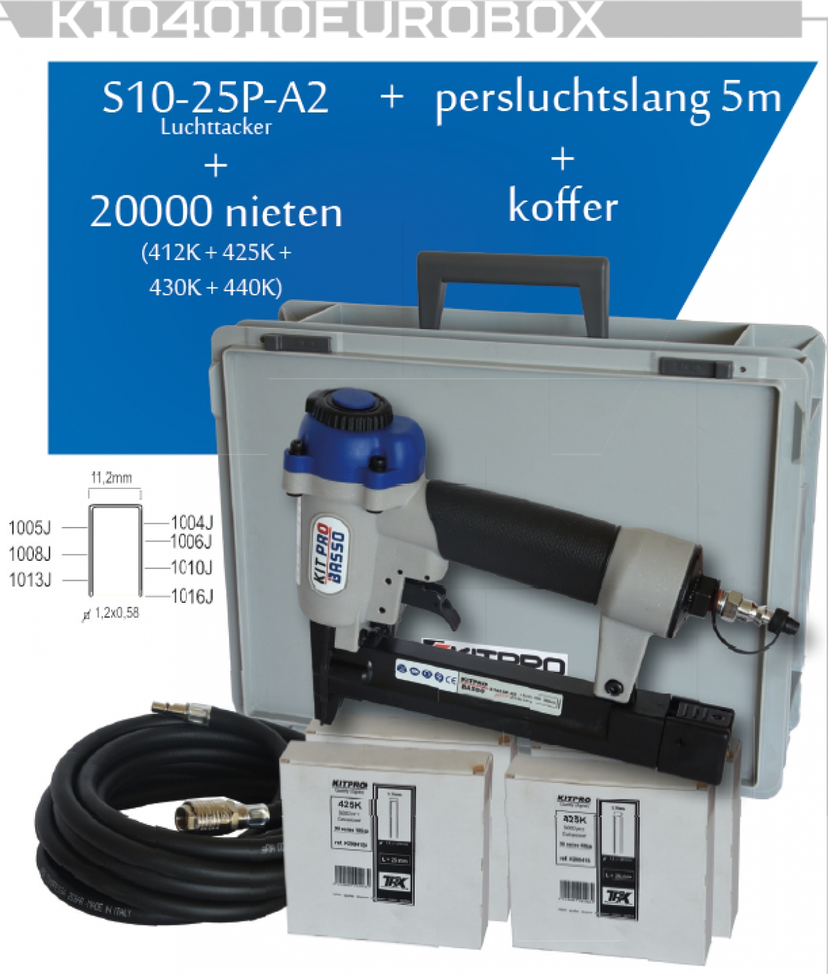 Kitpro basso s10/25p-a2 tacker nietpistool op perslucht voor 10j nieten 4-25mm inclusief 5m persluchtslang + 20000 nieten (412k+425k+430k+440k) + koffer K104010EUROBOX-TOU